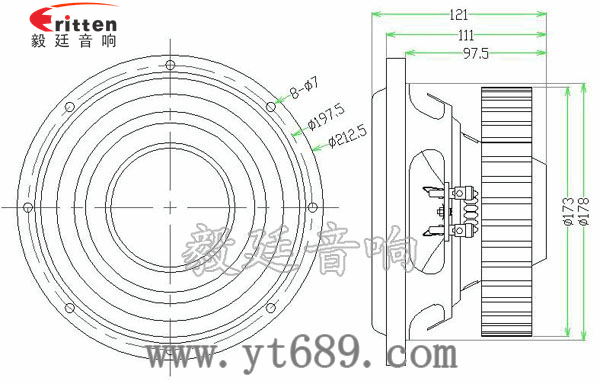 8寸圓形鐵盆架外磁重低音喇叭,采用了高性能鐵氧體,磁性強,外帶磁鋼套,音色飽滿;