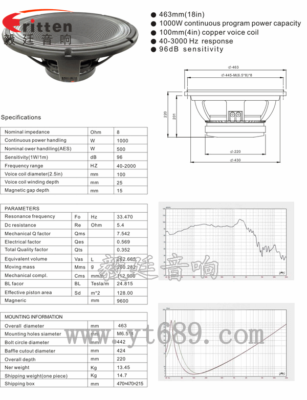 東莞市毅廷音響科技有限公司嚴格貫徹“質量讓您放心、服務讓您舒心、價格讓您動心,此款優異用于18寸500瓦重低音舞臺音響喇叭,最大峰值1000W,音域40Hz~2KHz,超重低音炮,下潛力強,音色清晰、質感飽滿,也可用于KTV音箱、廣場音箱上,音質飽滿。