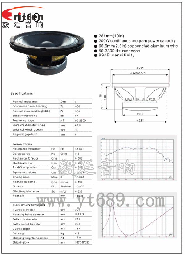 此款優異用于10寸75芯200W重低音喇叭,舞臺音響,額定功率為200W,最大功率為400W,毅廷音響科技有限公司工程師研發出發燒者的喜愛揚聲器,值得選購;