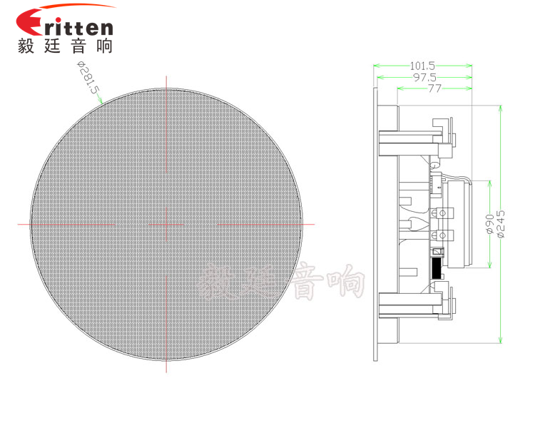 這款天花喇叭的外觀防塵罩,用的是高密度金屬網罩進過環保烤漆工藝,手感平滑,不褪色、不生銹、不氧化、超窄邊有圓形和正方形兩種防塵罩形狀,帶八個超強磁吸鐵,可吸性強,外觀大氣、精美,是毅廷喇叭工程師精心研發的一款超完美的8寸天花吸頂式喇叭。