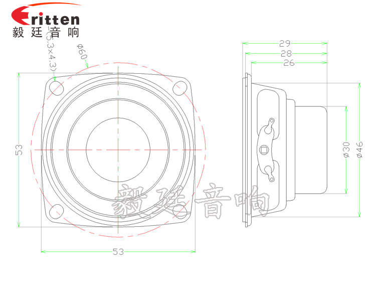 53mm方型鐵盆架內磁全頻喇叭,采用的是稀土高強磁,使音色清晰、飽滿;